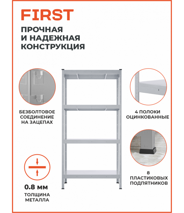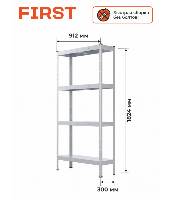 Стеллаж HIT 912x300x1824 мм, 4 металлические полки, оцинкованный создается из высокопрочной оцинкованной стали, что гарантирует надежность и долговечность конструкции.