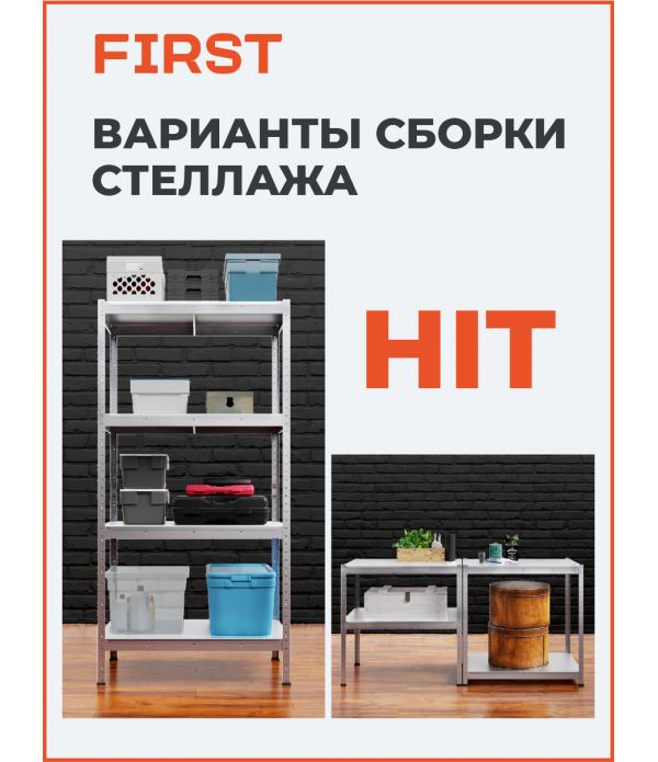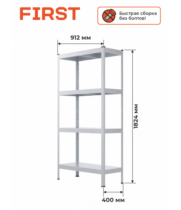 Стеллаж HIT 912x400x1824 мм, 4 металлические полки, оцинкованный создается из высокопрочной оцинкованной стали, что гарантирует надежность и долговечность конструкции.