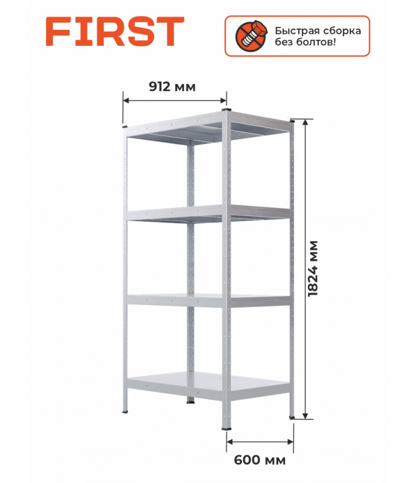Стеллаж HIT 912x600x1824 мм, 4 металлические полки, оцинкованный создается из высокопрочной оцинкованной стали, что гарантирует надежность и долговечность конструкции.