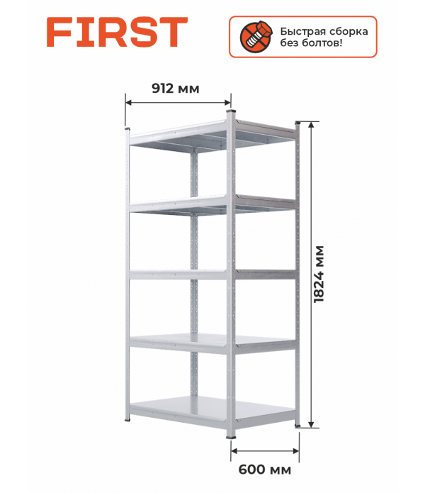 Стеллаж шириной 912 мм, глубиной 600 мм и высотой 1824 мм подойдет для любых помещений - офис, загородный дом, гараж, балкон.