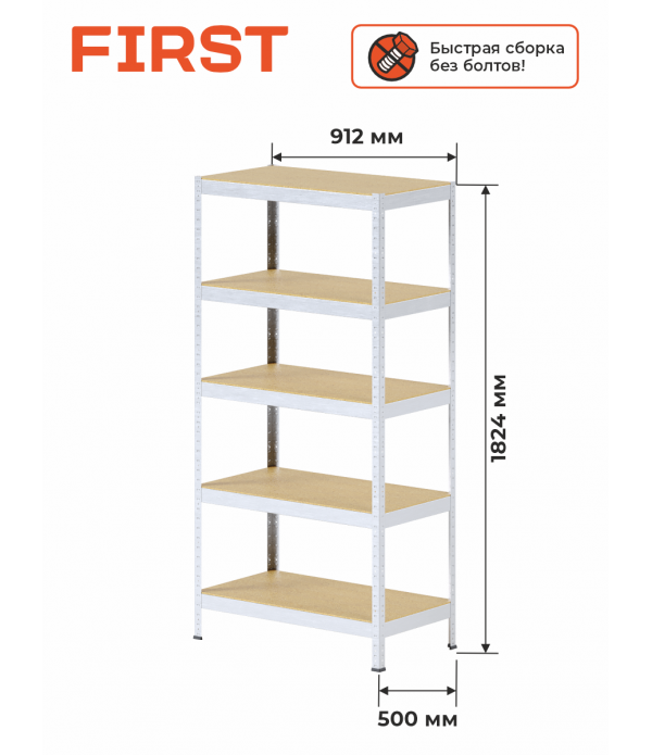 Стеллаж шириной 912 мм, глубиной 500 мм и высотой 1824 мм подойдет для любых помещений - офис, загородный дом, гараж, балкон.