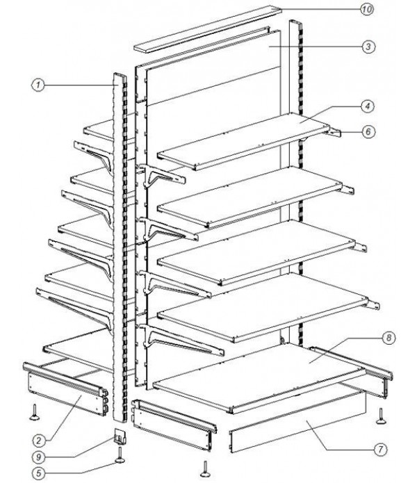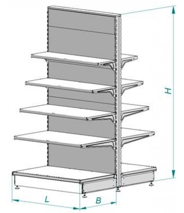 Стеллаж островной предназначен для продажи товара с двух сторон и установки в середине торгового зала, может быть дополнен комплектом торцевых полок глубиной 200, 300, 400 и 500 мм., ограничителями полок и пластиковыми ценникодержателями.