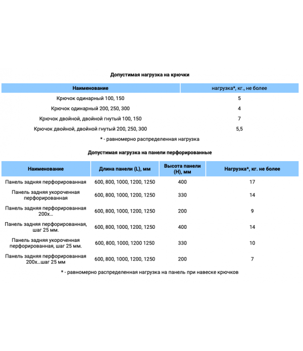 Комплектуется одинарными и двойными крючками длиной 150, 200, 250, 300 и 600 мм, которые устанавливаются на перфорированных панелях стеллажа.
