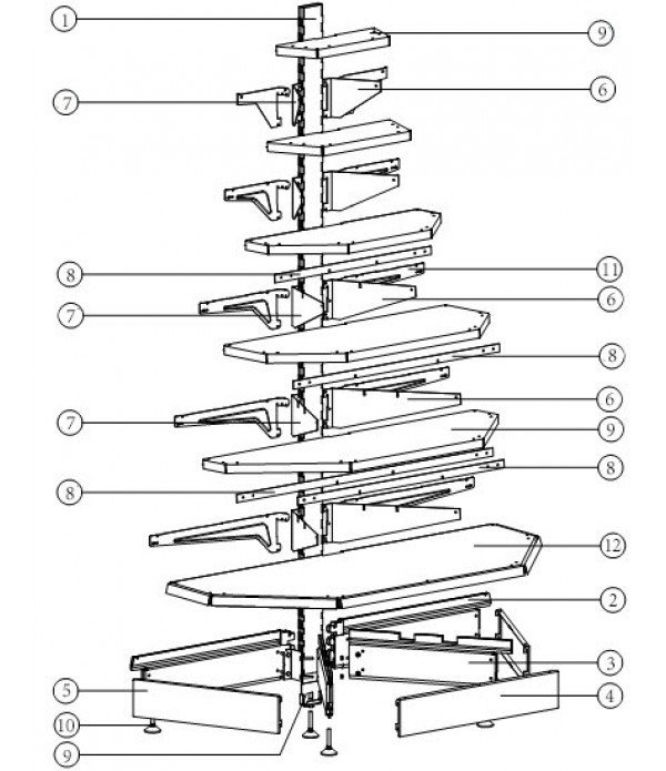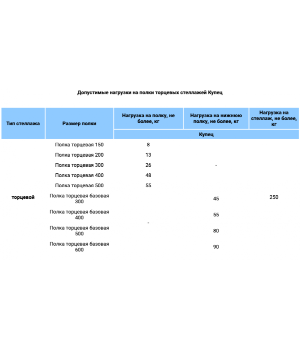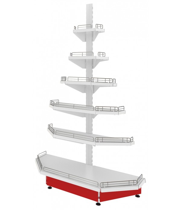 Стеллаж торцевой является завершением линии островных стеллажей внутри торгового зала магазина, имеет высоту и комплектацию полок, соответствующую островному стеллажу. Полки торцевых стеллажей устанавливаются на 4-х кронштейнах и имеют дополнительные ребра жесткости.